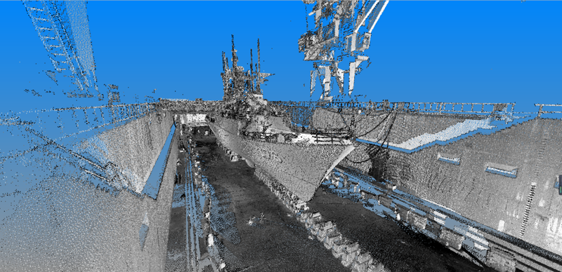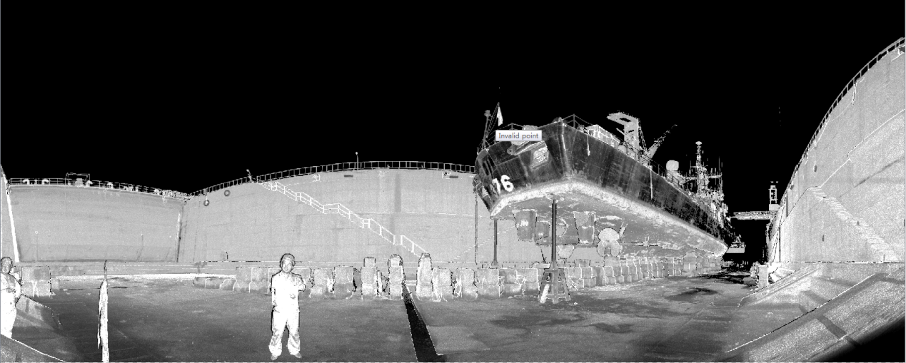 现场扫描单站使用360度快速模式,单站用时约5分钟,为了能更完整的获取点云数据,船体四周共架设11个扫描测站。
