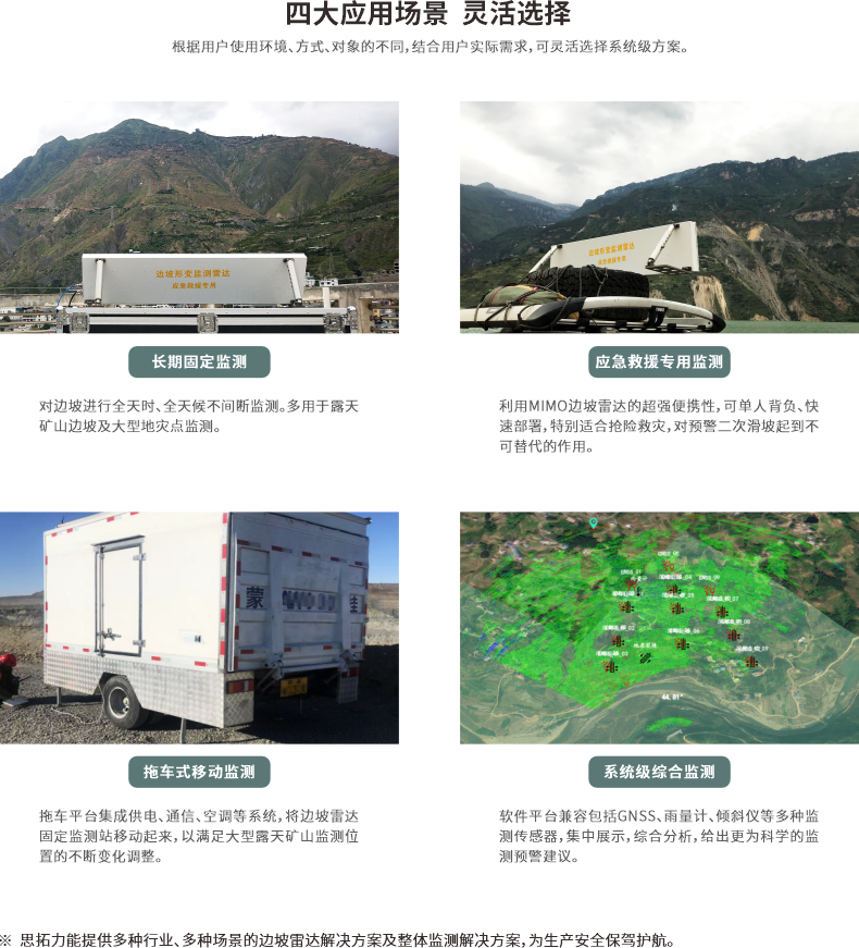 提供多种行业、多种场景的边坡雷达解决方案及整体监测解决方案,为边坡安全保驾护航。