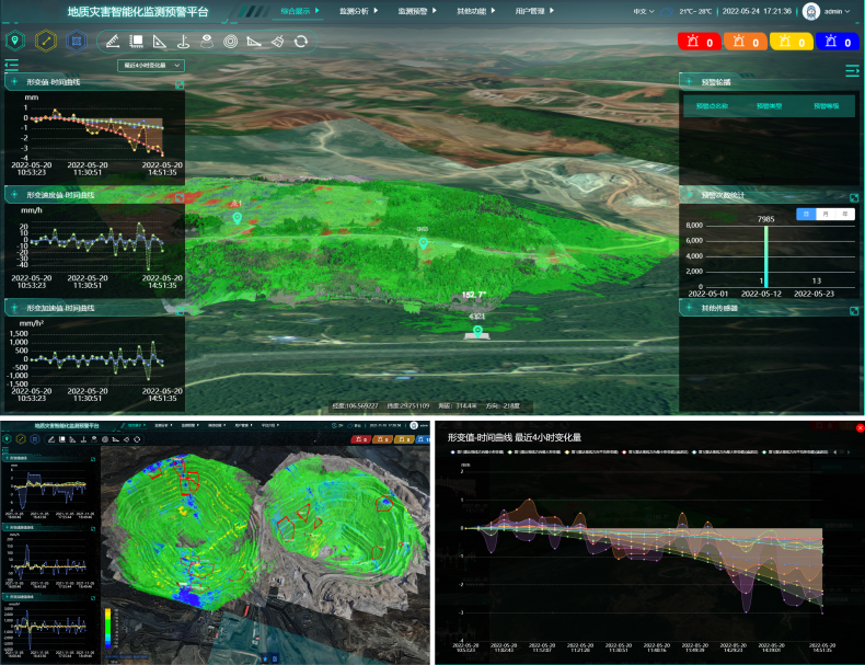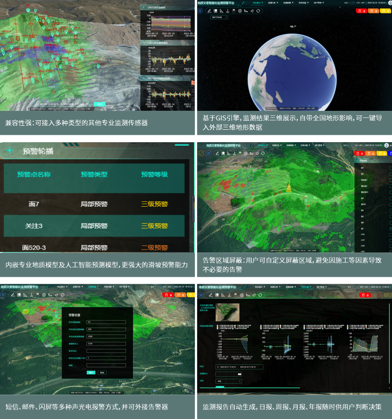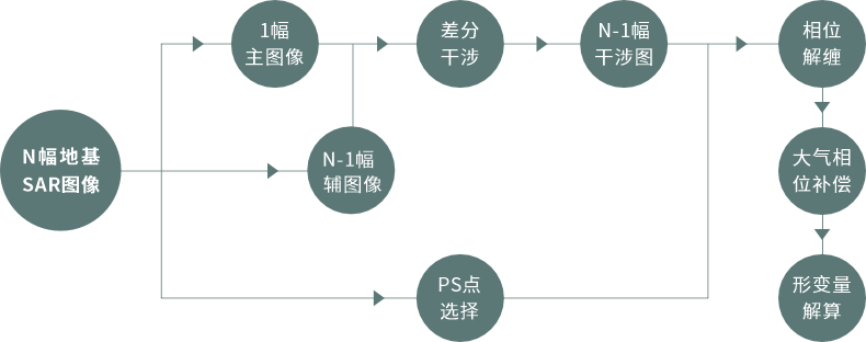 雷达设备基于SAR原理首先获得被测区域的雷达二维图像,将先后获得的多幅雷达图像序列进行配准后,系统完成永久散射点(PS点)选择、相位提取、相位解缠绕、相位校正、形变量解算及时间空间滤波等处理,系统可以获得被测区域各空间位置的形变信息,并经地理信息融合、三维图形转化、自动报表生成、预警与告警处理等,将形变信息、告警信息以不同形式提交给用户。