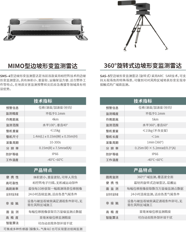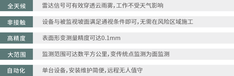 思微系列边坡形变监测雷达(地基差分干涉雷达)基于合成孔径(SAR)成像和差分干涉测量原理,可以在全天时全天候条件下,采用非接触方式对滑坡、危岩、坝体等风险区域地表形变进行大范围高精度监视测量,测量结果可以三维图形方式在用户端显示并根据用户需求自动生成相关报表,结合用户设置告警参数,系统可以通过声、光、短消息等方式向用户发出警告。